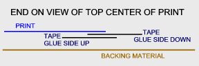 To make the hinge, use two 2 to 3 inch pieces of tape (6 inches for a 30x40 print). Place one piece of tape glue side up and the other glue side down, overlapping by 1/4 inch the long way, to become one piece as in the diagram.